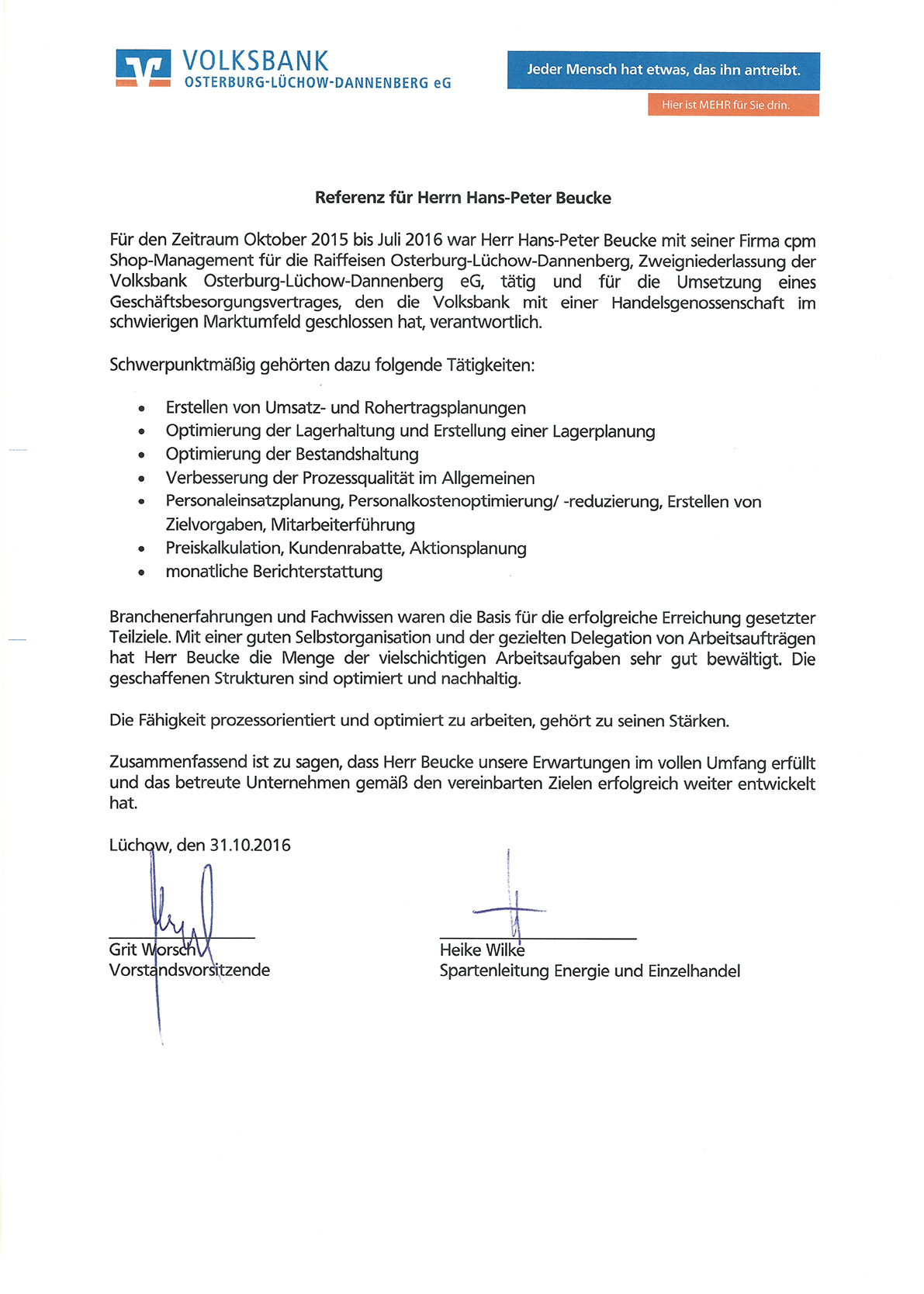 Zusammenfassend ist zu sagen, dass Herr Beucke unsere Erwartungen im vollen Umfang erfüllt und das betreute Unternehmen gemäß den vereinbarten Zielen erfolgreich weiter entwickelt hat.“